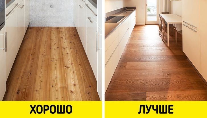 В длинной и узкой комнате не стоит укладывать напольное покрытие вдоль стен, чтобы оно повторяло геометрию помещения. Особенно это касается ламината. Попробуйте выложить ламинат поперек комнаты. Придется повозиться, корректируя его длину, и потратить чуть больше времени, но результат того стоит: визуально комната будет выглядеть шире и гармоничнее.