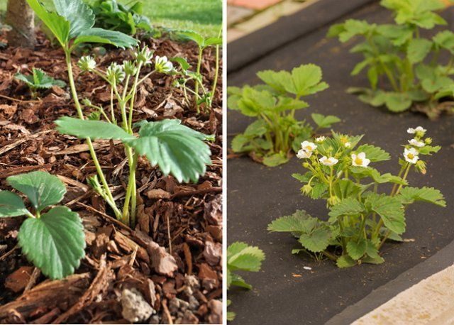 Мульчировать клубнику лучше всего органическим материалом: опилками, хвойным опадом, соломой (слоем не более 5 см). Иногда для укрытия почвы используют также газеты и картон (толщина слоя равна 1 листу картона или 5-10 листам газеты). Еще один неплохой вариант – агроволокно черного цвета. Его можно приобрести в садоводческом магазине.