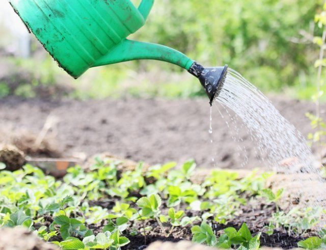 Полив после посадки. Первый год, когда клубника еще не цветет, можно поливать ее дождеванием. Листочки (в отличие от цветков) очень любят такой полив, совмещенный с купанием. Количество воды и частота поливов зависит от погодных условий и почвы. В среднем, поливать растения можно 1 раз в неделю, а в жаркий период – 1 раз в 3 дня. Желательно, чтобы вокруг каждого кустика были сделаны холмики высотой около 20 см. Первый месяц после посадки при поливе такие лунки можно полностью заполнять водой.