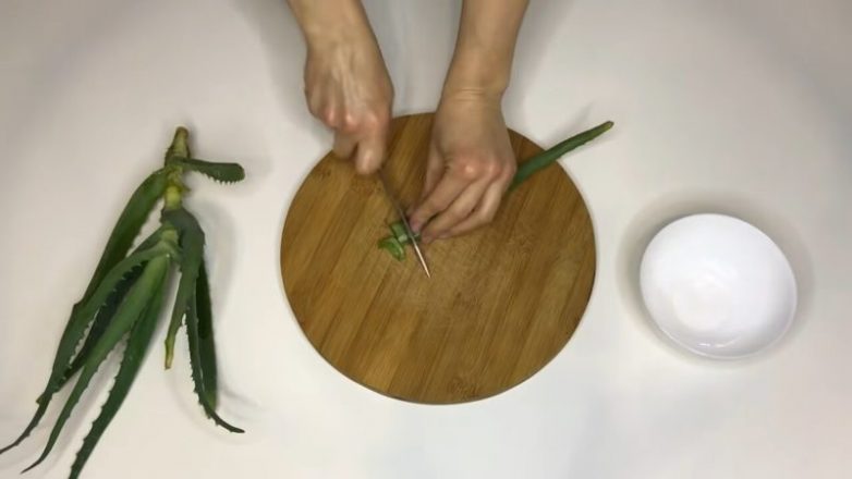 Алоэ нужно взять зрелый — растению должно быть не менее 1 года. Перед применением желательно подержать срезанный алоэ в холодильнике (примерно 3 дня). Нарежьте листья алоэ, не очищая от кожицы и игл, на кусочки.