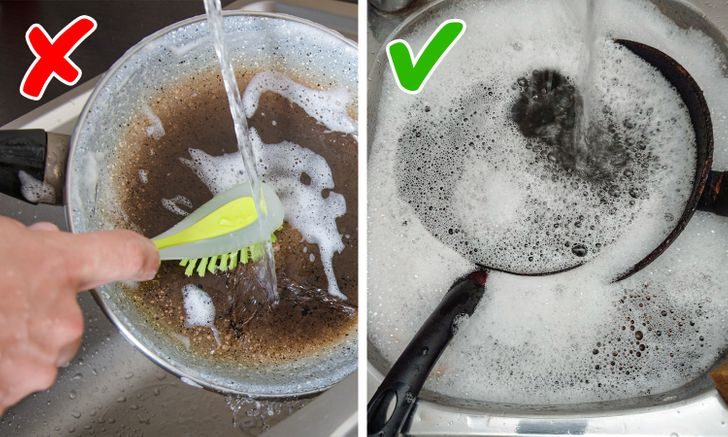 Жир и пригоревшие кусочки пищи отмыть достаточно сложно. Иногда очистка одной сковородки занимает больше времени, чем мытье целой стопки тарелок. Но можно просто наполнить раковину теплой водой, добавить немного моющего средства и после готовки отправить туда грязную посуду. Главное, чтобы кастрюли и сковородки успели остыть. Посуда полежит в мыльной воде, и отмыть ее потом будет гораздо проще.