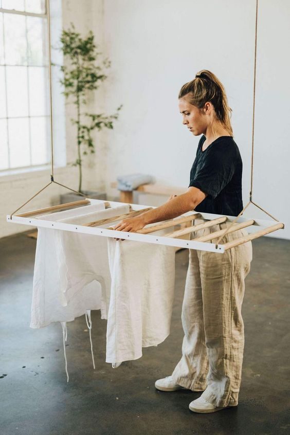 Практичная раздвижная конструкция позволит быстро собрать и разобрать ее, развесить и высушить белье, а потом спрячется в шкафу до следующей стирки. Стильное сооружение можно и не убирать, если есть для него место, ведь стирать приходится часто.