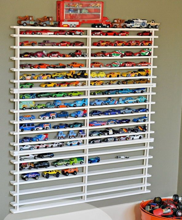 Машинками мальчики могут забавляться целыми днями. Как бы много их не было в доме, малыш обязательно при очередном походе в магазин выпросит еще одну новую модель. Упорядочить хранение машинок можно созданием настенного стеллажа, превратив его в “автомобильный гараж”.