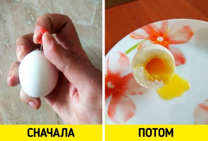 Сварить идеальное яйцо всмятку можно, если бросить его в кипящую воду и засечь 5–7 минут в зависимости от размера. Но яйца часто трескаются в горячей воде. Чтобы этого избежать, достаточно проколоть скорлупу с тупого конца на 2–3 мм. Есть даже специальное устройство, но в его отсутствие можно воспользоваться канцелярской кнопкой.