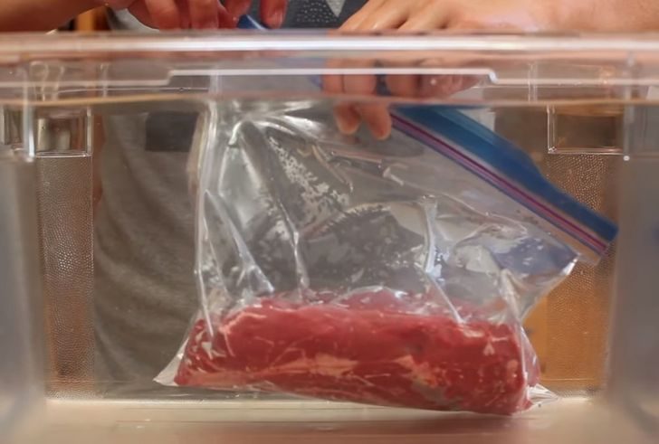 Поместить продукты в вакуум без специального прибора все-таки можно. Понадобится пакет ziplock и емкость с водой. Вода вытеснит лишний воздух