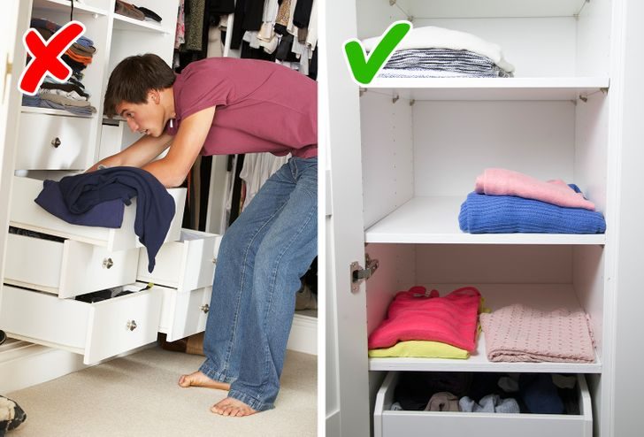 В таком случае лучше разделите вещи на 2 категории. К примеру, на первую полку положите те, которые вы используете каждый день или чаще всего. Там они должны располагаться свободно. А вторую полку можно забить плотнее.