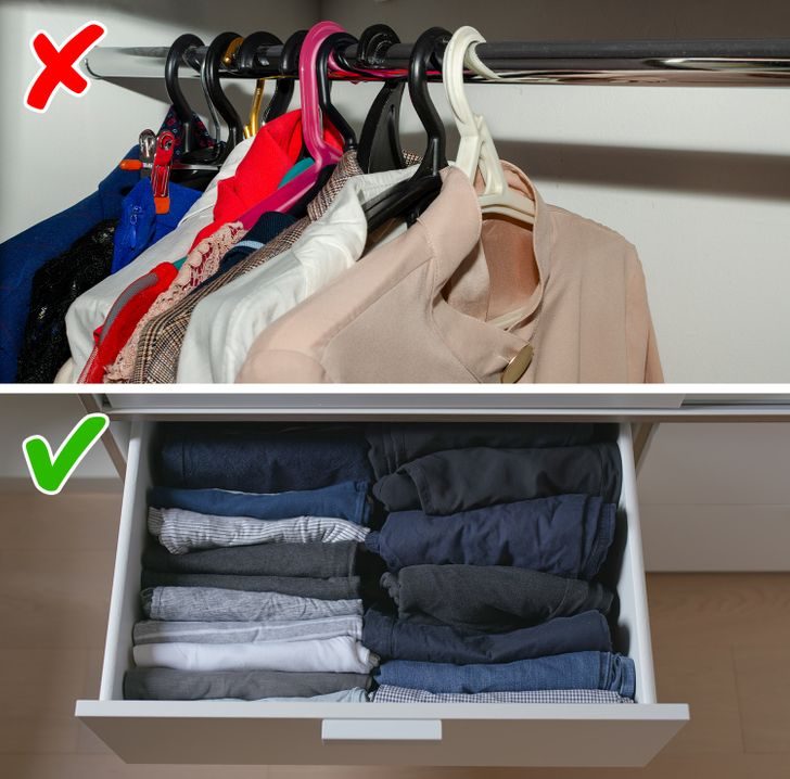 Об этой ошибке говорит Мари Кондо в своей знаменитой книге. Дело в том, что вещи на вешалках занимают больше места. Но нам кажется, что размещенный таким образом предмет гардероба проще найти. На самом деле это не так.