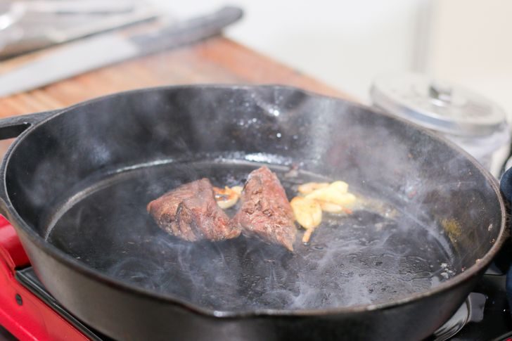 Оливковое масло имеет довольно низкую температуру горения, поэтому оно начинает дымиться раньше, чем наше мясо попадет на сковородку. Во-первых, это невкусно, а во-вторых, совсем не безопасно. Поэтому для жарки надо использовать другое масло (например, подсолнечное), а каплей оливкового приправлять уже готовый стейк.