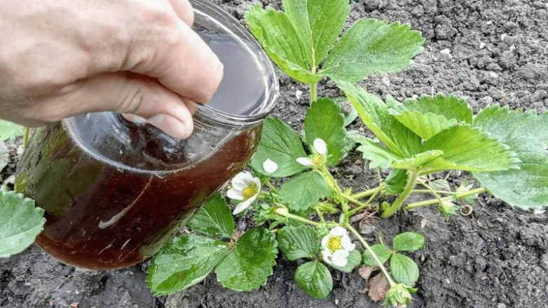 На 1 куст клубники вылейте 1 л воды. Поливайте по уже влажной, ранее пролитой почве. Такую подкормку можно начать проводить в мае и повторять каждые 2 недели.