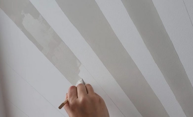 Для того, чтобы сделать разметку для будущих лучей на стене, отметьте центр стены по линии окрашивания и сверху. После этого разделите каждую часть на две равных части и проведите линию к точке в центре линии окрашивания. Продолжайте делить пространство до тех пор, пока не получите лучи желаемой толщины.
