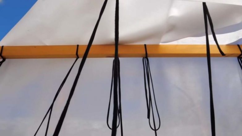 Сверху идёт нетканый белый материал, который создаёт эффект парника. Внутри также есть две перегородки по центру — на них можно подвязывать растения. Когда растения вырастут, то подвязку можно сделать на самую верхнюю балку.