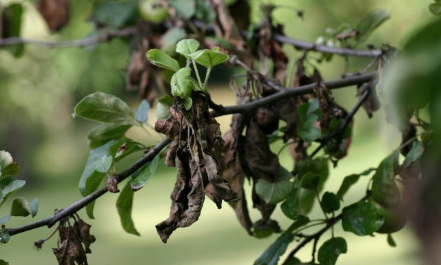 При бактериозе все растение выглядит обожженным – листья, ветки, ствол, плоды. Сперва все дерево покрывают черные пятна, затем листья скручиваются и опадают. Плоды темнеют, останавливаются в развитии и портятся.