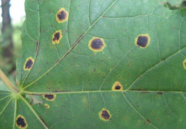 Зачистите пораженные участки ножом до здоровой древесины. Продезинфицируйте рану 5%-ным раствором железного купороса. Замажьте срез пастой РанНет или садовым варом. С интервалом в месяц дважды обработайте дерево 1%-ной бордоской жидкостью.Черные пятна на листьях деревьевЕсли с черными пятнами на коре все однозначно, то поразить листву плодовых деревьев может гораздо больше заболеваний. Помимо того же черного рака подобный эффект, как правило, вызывают несколько грибковых или бактериальных заболеваний.