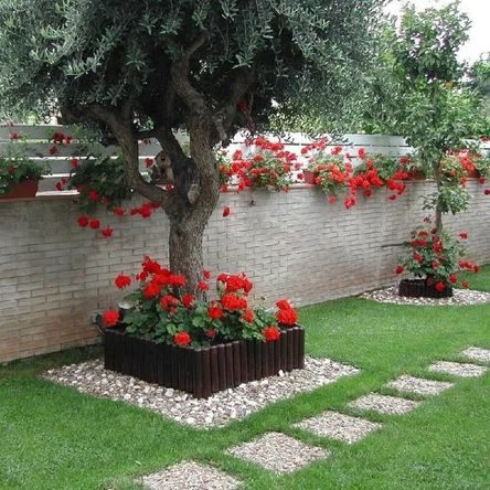 Земля вокруг дерева не должна простаивать зря. Поставьте ограду и посадите цветы или низкие кустарники.