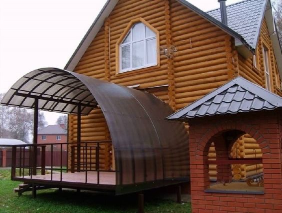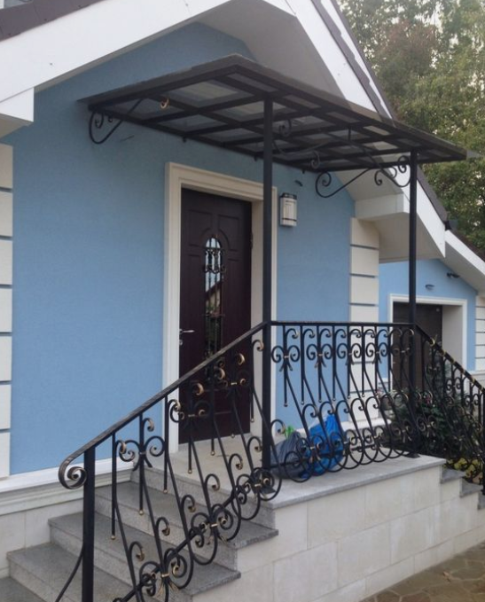 Навес над крыльцом из плексигласа призван защищать его от непогоды и палящих лучей солнца. В то же время он свободно пропускает свет, так что веранда и крыльцо не будут смотреться мрачно и неуютно.