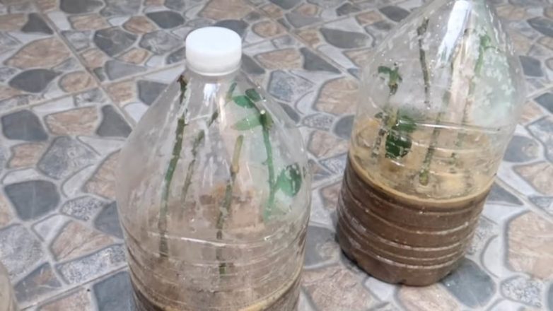 Насыпьте в бутылки обыкновенный песок. Через горлышко бутылки вставьте черенки в песок. В одну 5-литровую бутылку поместится примерно 4 черенка.