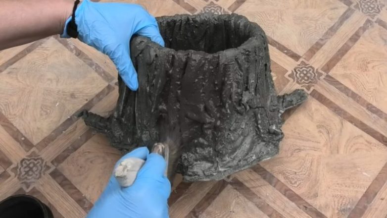Разведите по инструкции жидковатый цемент, пропитайте им ткань. И наденьте ткань на обрезанное ведро. Работайте в перчатках. Пальцами сделайте складки и корни из ткани, как у реального пенька. Вся работа едва ли занимает 10 минут.