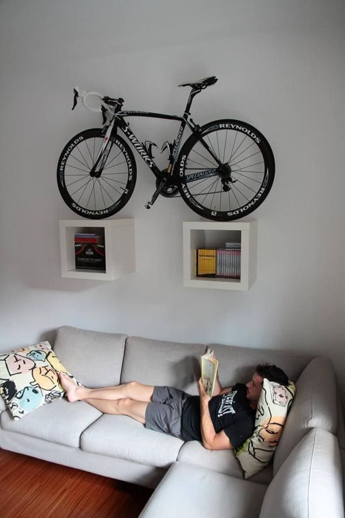 Если в квартире нет балкона, можно самостоятельно установить крючки и навсегда забыть о проблеме хранения велосипеда. Нужно рассчитывать нагрузку с запасом. Велосипеды гармонично вписываются в интерьер и кажутся оригинальным элементом декора.
