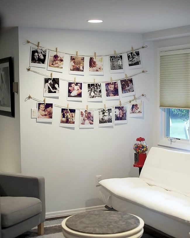 Не обязательно использовать рамки со стеклом. Возьмите обычную веревку, прищепки и устраивайте собственные выставки каждую неделю, месяц или год.