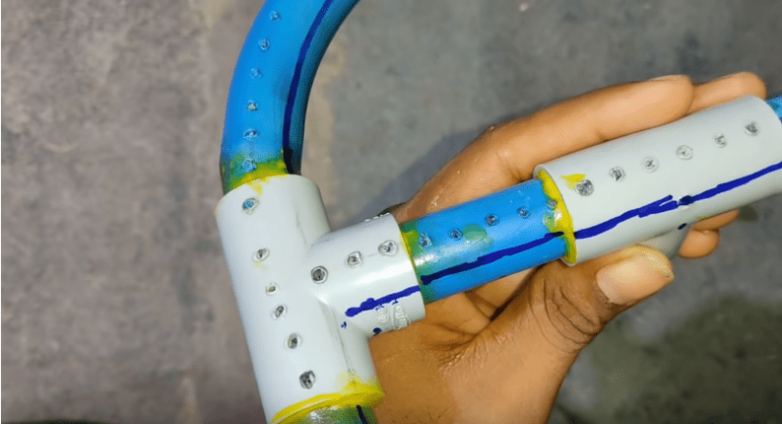 Далее отмеряем длину окружности на PVC трубе. В нашем случае это 35-дюймовая труба. Также добавляем к длине окружности 4 см для будущего крепления. Отрезаем от трубы отрезок получившейся длины, а затем разрезаем его на 2 равные части.