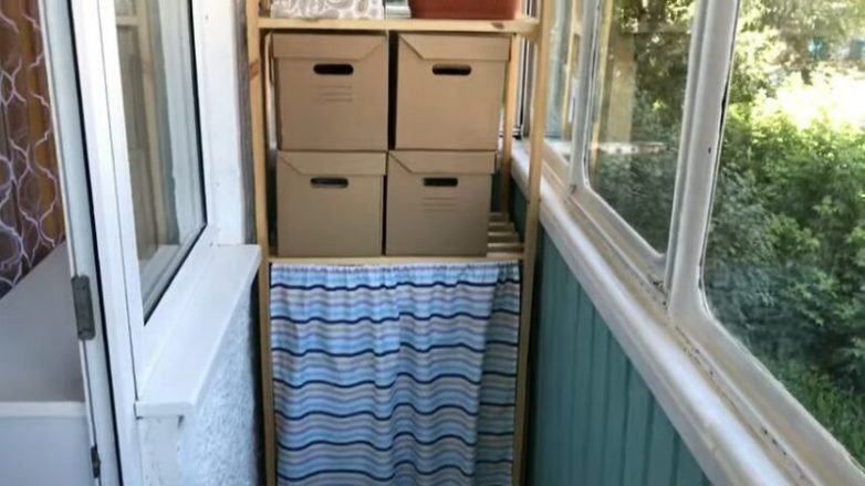 В такой стеллаж очень удобно расставить коробки и корзинки с вещами, которыми сейчас вы не пользуетесь. Чудесное бюджетное преображение старого хрущёвского балкона!