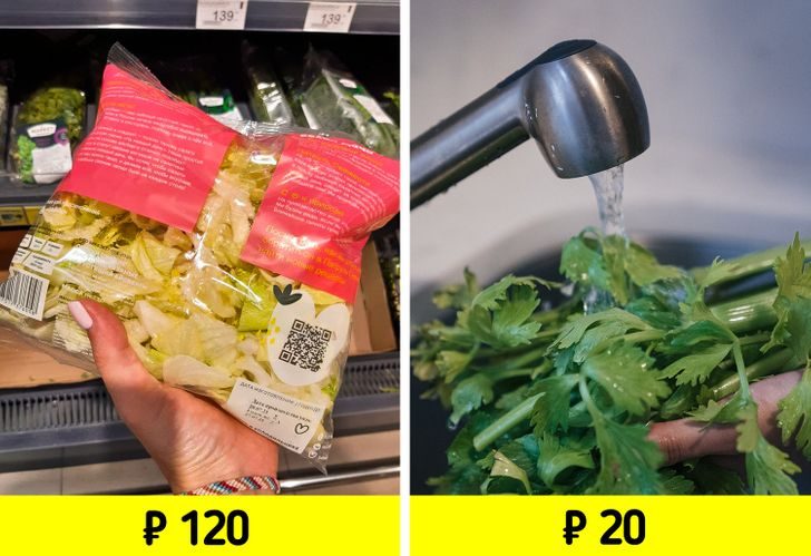 Вместо фасованных салатов наподобие айсберга и романо я стала покупать у бабушек на рынке знакомые с детства петрушку, укроп, лук и щавель. Если раньше на салаты уходило как минимум ₽ 250 в неделю (₽ 1 000 за 4 недели), то теперь эти же ₽ 250 покрывали все расходы на зелень за месяц.