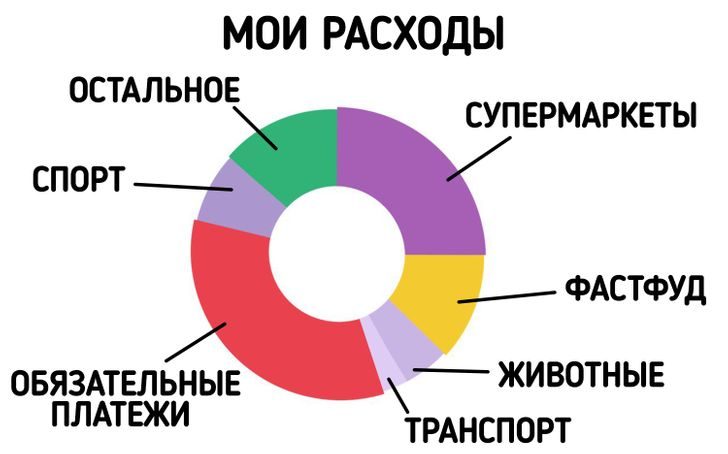 Первым делом я обратилась к выпискам с банковских счетов, чтобы выяснить, в какую трубу вылетают деньги. Результаты меня неприятно удивили. Оказалось, что четверть зарплаты я трачу на продукты питания и бытовые товары, более 10 % — на фастфуд и кофе навынос.