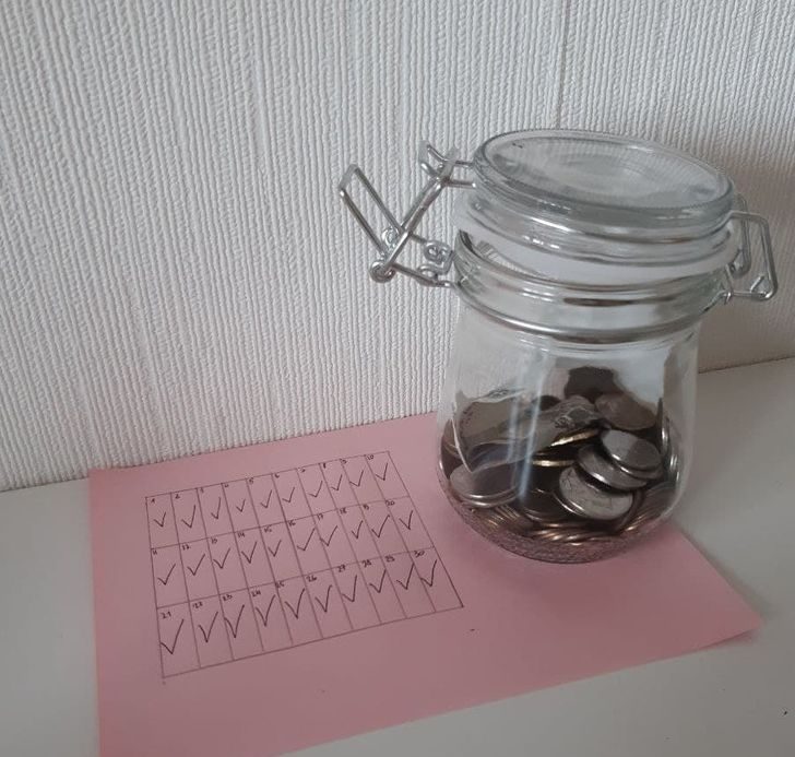 Кроме того, я решила механически закрепить привычку откладывать деньги. Каждый день я заполняла копилку по следующей схеме: в 1-й день клала в банку ₽ 1, во 2-й — ₽ 2, в 3-й день — ₽ 3… И так 30 дней. Таким образом, ежедневно откладывая по чуть-чуть, я незаметно для себя накопила ₽ 465.