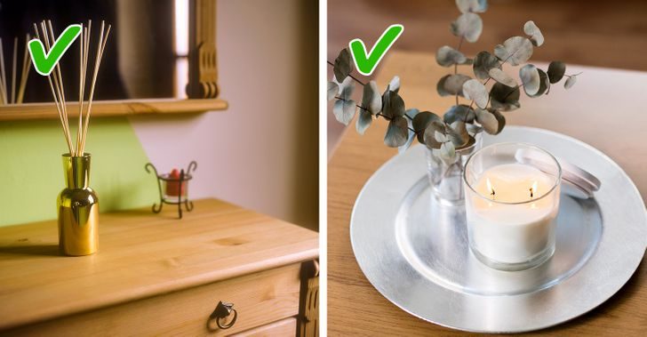 Каждый отель имеет свой аромат. Хороший парфюм важен для создания приятной атмосферы в доме. Вы можете использовать масло в диффузоре с разными нотами для каждой комнаты. Для штор или покрывал при стирке можно применять кондиционер с определенным запахом. В ванной уместны, например, ароматические палочки, а в комнатах — свечи.