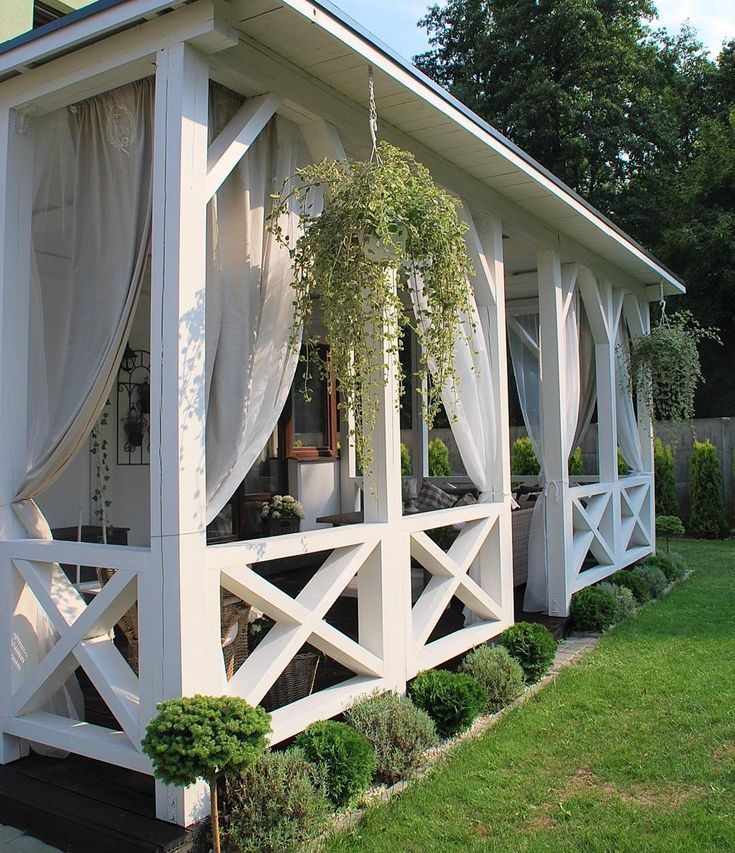 А почему бы на террасе не повесить шторы? Вы только присмотритесь, как преобразилась территория на фотографии. Особенно шикарно смотрятся безупречные белые шторы, а для уюта можно еще добавить темные и плотные шторы.