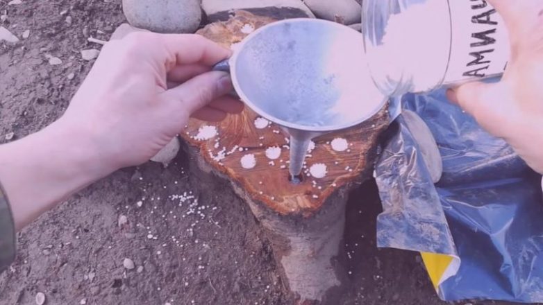 Время от времени нужно подсыпать селитру, чтобы процесс пошёл быстрее. Через некоторое время пень «умрёт» (сгниют корни), и можно будет его выкопать, как и остальную поросль.