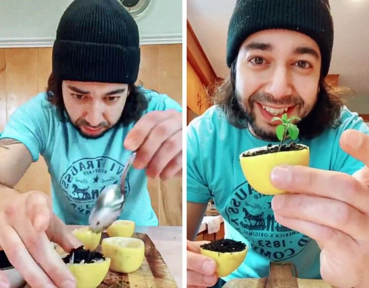 И лимон тоже выбрасывать не надо, ведь из него получатся отличные кашпо! Армен советует обрезать половинки снизу, чтобы они стали более устойчивыми, заполнить их землей и поместить в каждую по одной семечке. Что может быть более милым, чем эти миниатюрные растения?