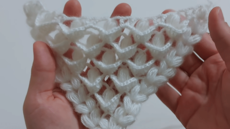 3-й ряд: ВП (подъемная), 1 ПшС,2ВвП, 1 ПшС, 3 ВП, 1 ССН в перемычку предыдущего ряда, 3 ВП, 1 ССН в то же место, 3 ВП, 1 ПшС, 2 ВП, 1 ПШС, поворотная ВП.