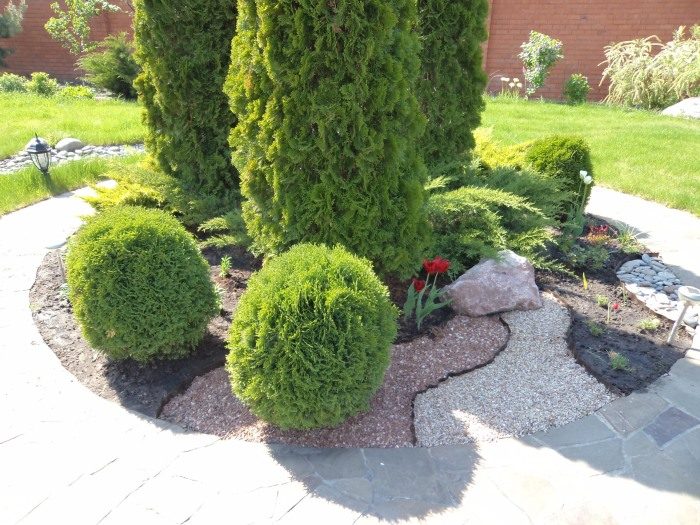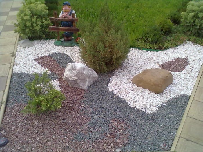 Светлая галька играет вспомогательную декоративную роль, а также служит обрамлением границ.