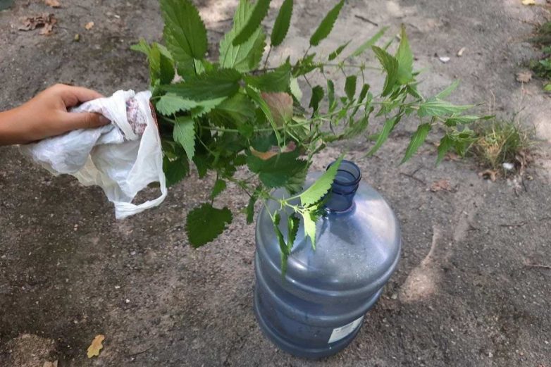 Сорви 2–3 стебля крапивы. Крупно поруби их ножом. Протолкни в бутылку. Добавь воды и взбалтывай до полного очищения.