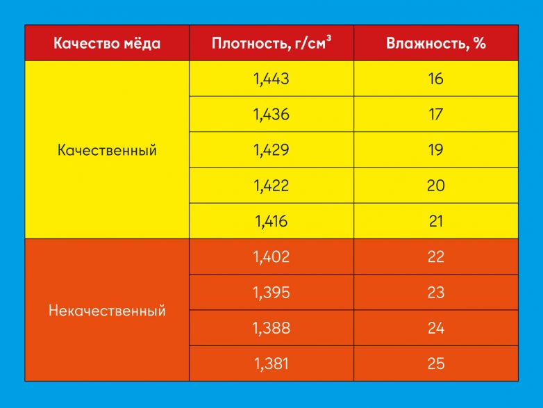 Добавим, что во многих странах плотность мёда является главным параметром оценки его качества. Так, в Канаде нижний порог должен быть не менее 1,47 г/см³, в Австралии — 1,45 г/см³, а в России — 1,41 г/см³. По словам опытных покупателей, продукт с влажностью 15–17 % в продаже не сыскать, а 21 % — это уже признак низкого качества. Поэтому ориентироваться стоит на 18–19 %.