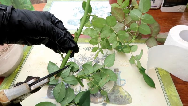 Для начала розы нужно нарезать на черенки длиной примерно в 15-20 см. Верхний срез должен быть прямым, нижний — косым, а лишние листья отрезаются. После этого черенки необходимо окунуть в воду, a затем — в золу.