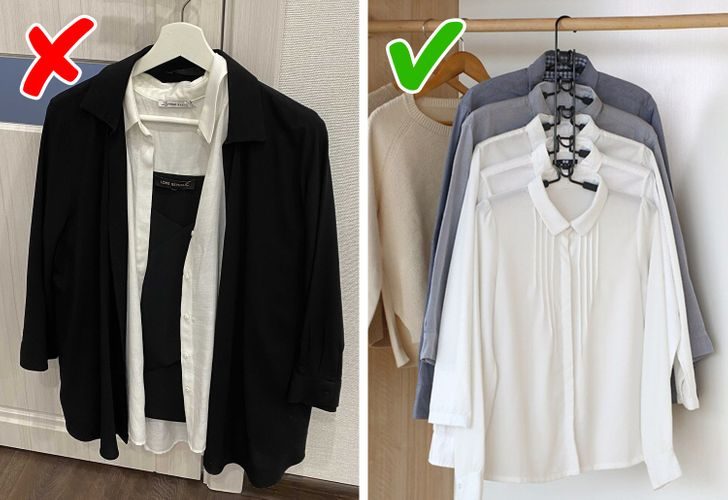 Повесить несколько вещей на одну вешалку, пожалуй, одна из худших затей. Места от этого больше на самом деле не станет, но вещам может стать заметно хуже: как минимум все сильно помнется, как максимум — что-то неприглядно растянется. Зато можно рассмотреть варианты вешалок, которые действительно предназначены для хранения нескольких предметов гардероба.