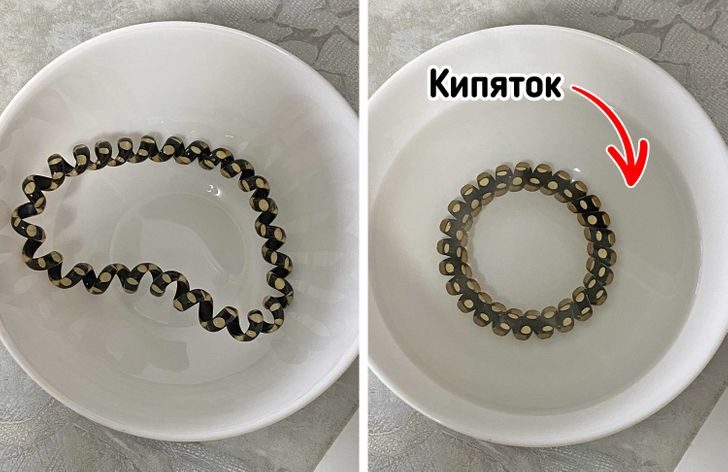 К счастью, вернуть резинке первозданный вид проще простого: нужно положить ее в небольшую глубокую посуду и залить кипятком. Она тут же сожмется и обретет прежнюю форму. Дайте ей прогреться в течение нескольких секунд, вылейте воду и аккуратно выньте из миски или тарелки (осторожно, горячо).