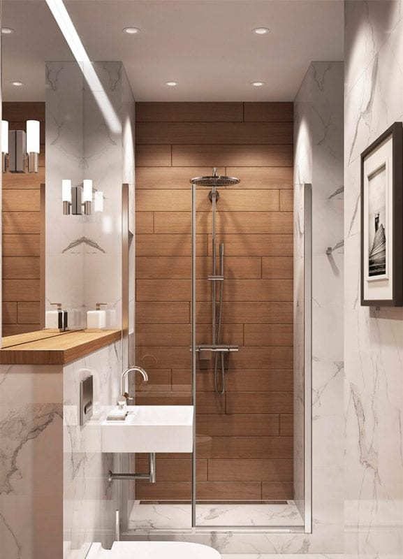 Стеклянные детали – это всегда стильно и красиво. Также за счет своей прозрачности они не так сильно перегружают маленькую комнату. Только будьте готовы часто протирать стекло, чтобы на нем не оставались капли от воды.
