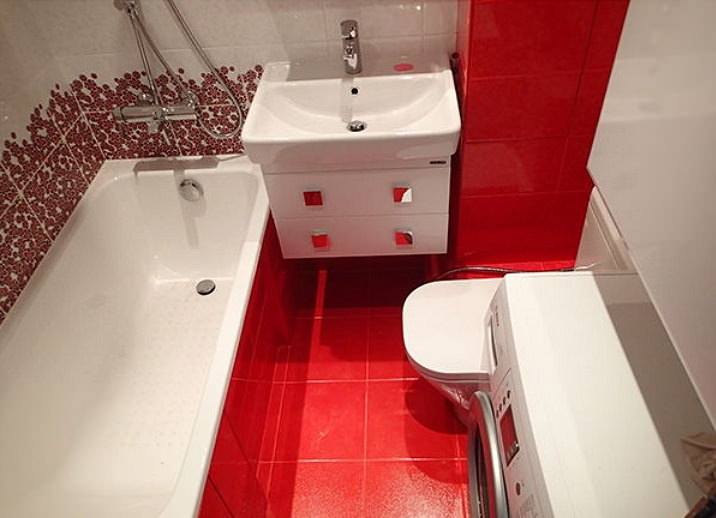 В этой ванной комнате есть все необходимое: сама ванна, туалет, раковина, стиральная машинка и даже небольшой стеллаж. При этом расставлена мебель очень компактно, тем самым места вполне хватит для одного человека.