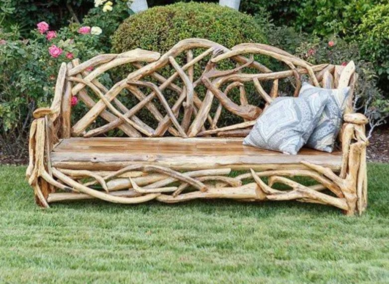 Скамейка из настоящего дерева – это уже плюс к вашей оригинальности. Но если эта скамейка сделана из настоящих веток и спила дерева, то выглядит она гораздо эффектнее.