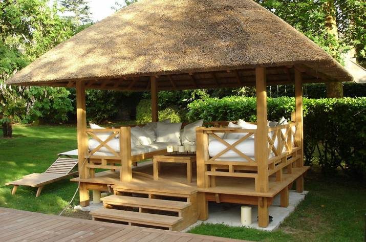 Привычный вид беседки – это так скучно! Лучше смастерите интересную конструкцию с необычной крышей, а также уютным местом для отдыха внутри.