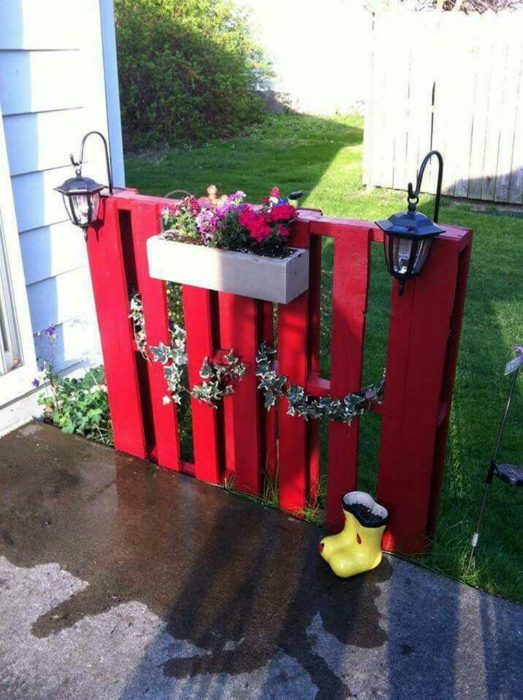 Яркая калитка, которую можно сделать из поддона, покрашенного в красный цвет и украшенная цветочным ящиком и парой фонариков, позволит очертить границы сада и станет настоящей изюминкой ландшафта.
