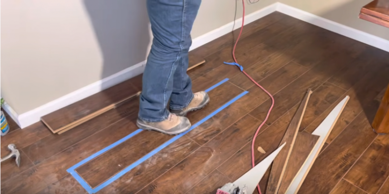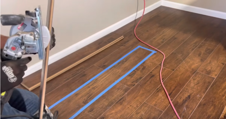 В первую очередь необходимо выделить доску, требующую замены. Делаем это при помощи малярного скотча. Кроме того, таким образом мы защитим края соседних досок. Затем необходимо пропилить поврежденную доску. Для этого можно воспользоваться ручной дисковой пилой или лобзиком. Однако здесь необходимо обратить внимание на то, чтобы глубина пропила соответствовала толщине доски, поэтому обязательно выставляем необходимый уровень.