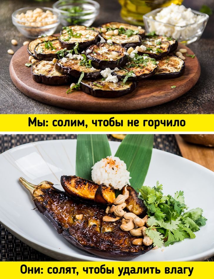 Многие отказываются от того, чтобы подсаливать баклажаны, утверждая, что время, когда необходимо было «вытаскивать» из овощей горечь, прошло: выведены новые сорта, которые не нуждаются в такой обработке. Однако в азиатской кухне баклажаны по-прежнему подсаливают и промакивают бумажными полотенцами.