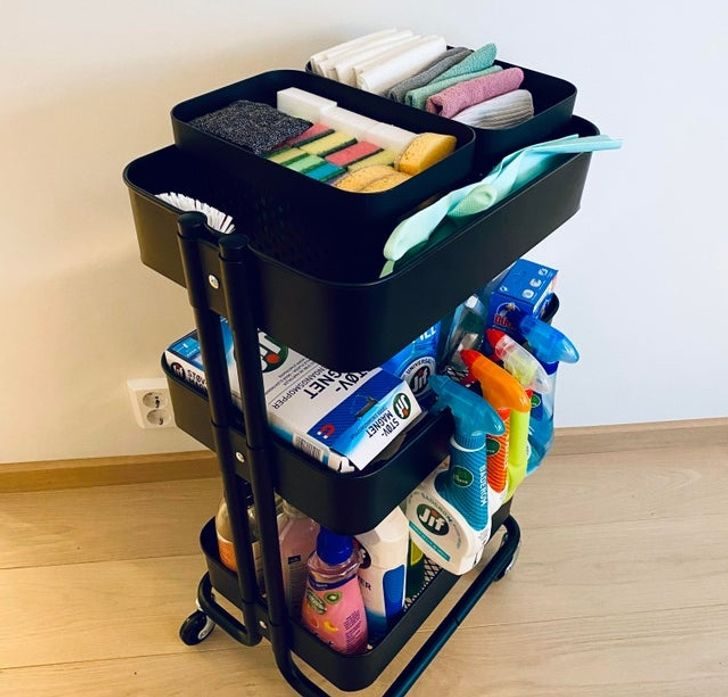 Ничего не имеем против аккуратного хранения чистящих средств и принадлежностей на полках. Однако, согласитесь, каждый из нас не раз ловил себя на том, что в процессе уборки приходится бегать из комнаты в комнату, чтобы захватить какой-нибудь спрей или губку (что особенно утомительно в частном доме). Чтобы избавить себя от этой беготни, можно хранить все необходимое в тележке на колесиках и просто катать ее с собой во время уборки.