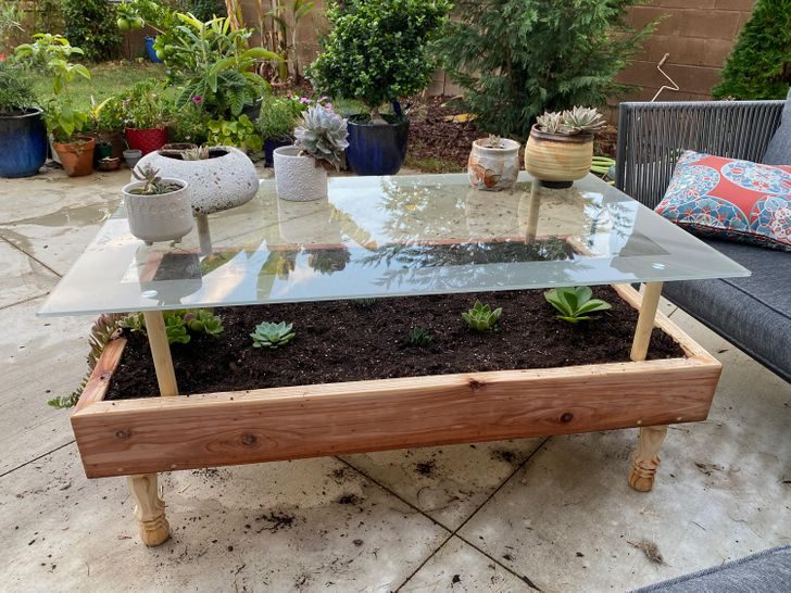 10. «Нашел кусок стекла в мусорном контейнере и приспособил его для этого кофейного столика с суккулентами»