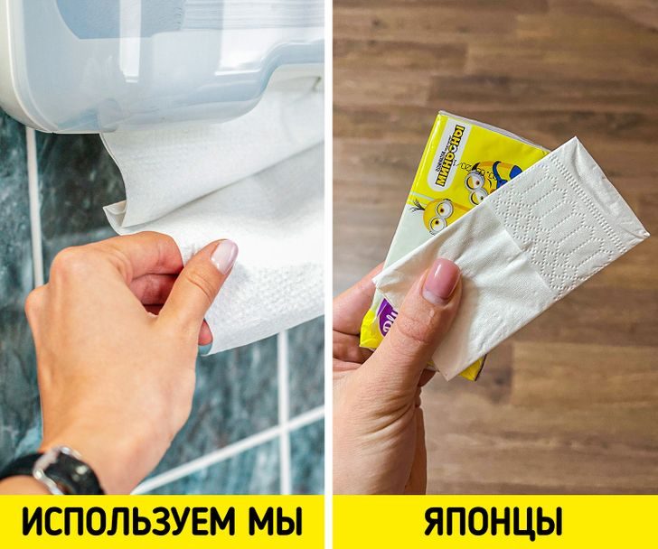 В общественных туалетах Японии редко встретишь бумажные полотенца, которые обычно используем мы. Оказывается, многие жители этой страны привыкли носить с собой индивидуальные платочки, которыми можно вытереть руки. В остальном про общественные туалеты в Японии можно сказать только одно: они и правда очень чистые и функциональные. Здесь есть раковины с дозаторами воды и мыла, которые реагируют на датчики, и нет необходимости прикасаться к крану. А в ресторанах вам и вовсе подадут ошибори — влажные полотенца, чтобы очистить руки перед приемом пищи.