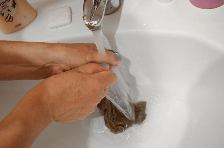 Постарайтесь не тереть слишком сильно и не делать резких движений, чтобы исключить механические повреждения. Важно очистить не только следки колготок, но и область промежности — в этих местах скапливается больше всего бактерий. Замочите колготки на 10 минут и промойте холодной водой.